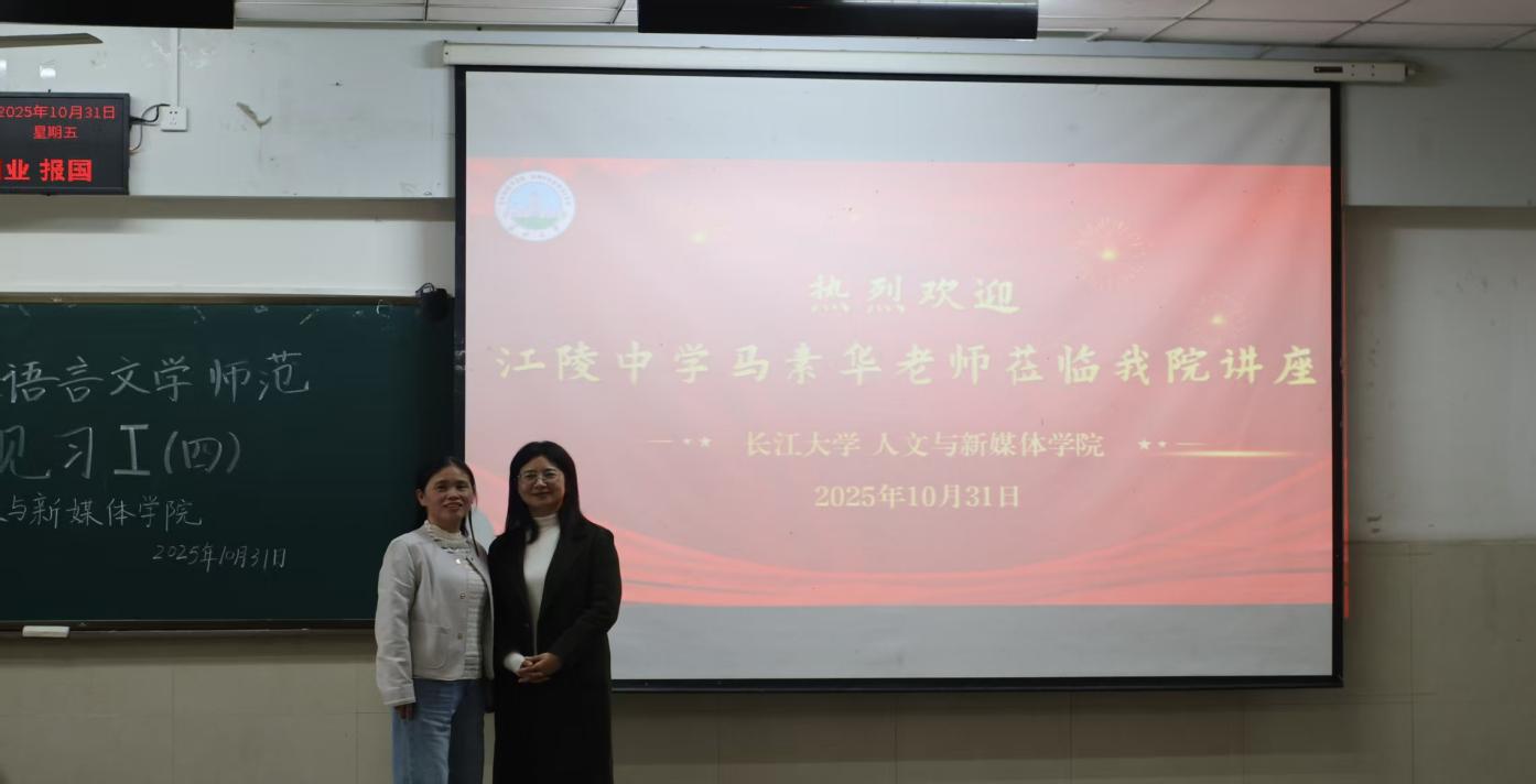 (通讯员彭迪)为夯实师范生教育教学基本功,提升教学技能,我们于2025年10月31日下午在东校区12教102举行了2023级中文师范专业教育见习第四次讲座。本次活动特邀湖北省江陵中学高级教师马素华,作题为《从“教课文”到“育素养”:新课标背景下〈劝学〉的深度备课策略》的专题分享。讲座由章芳老师主持,张丽老师、周霜老师及2023级全体中文师范生参加。